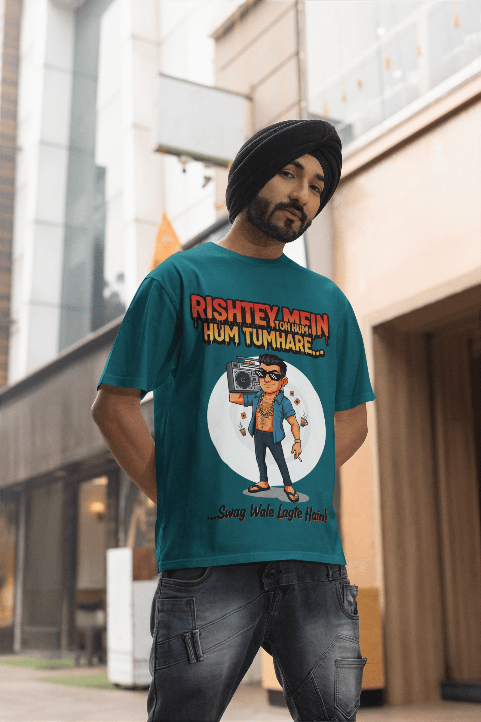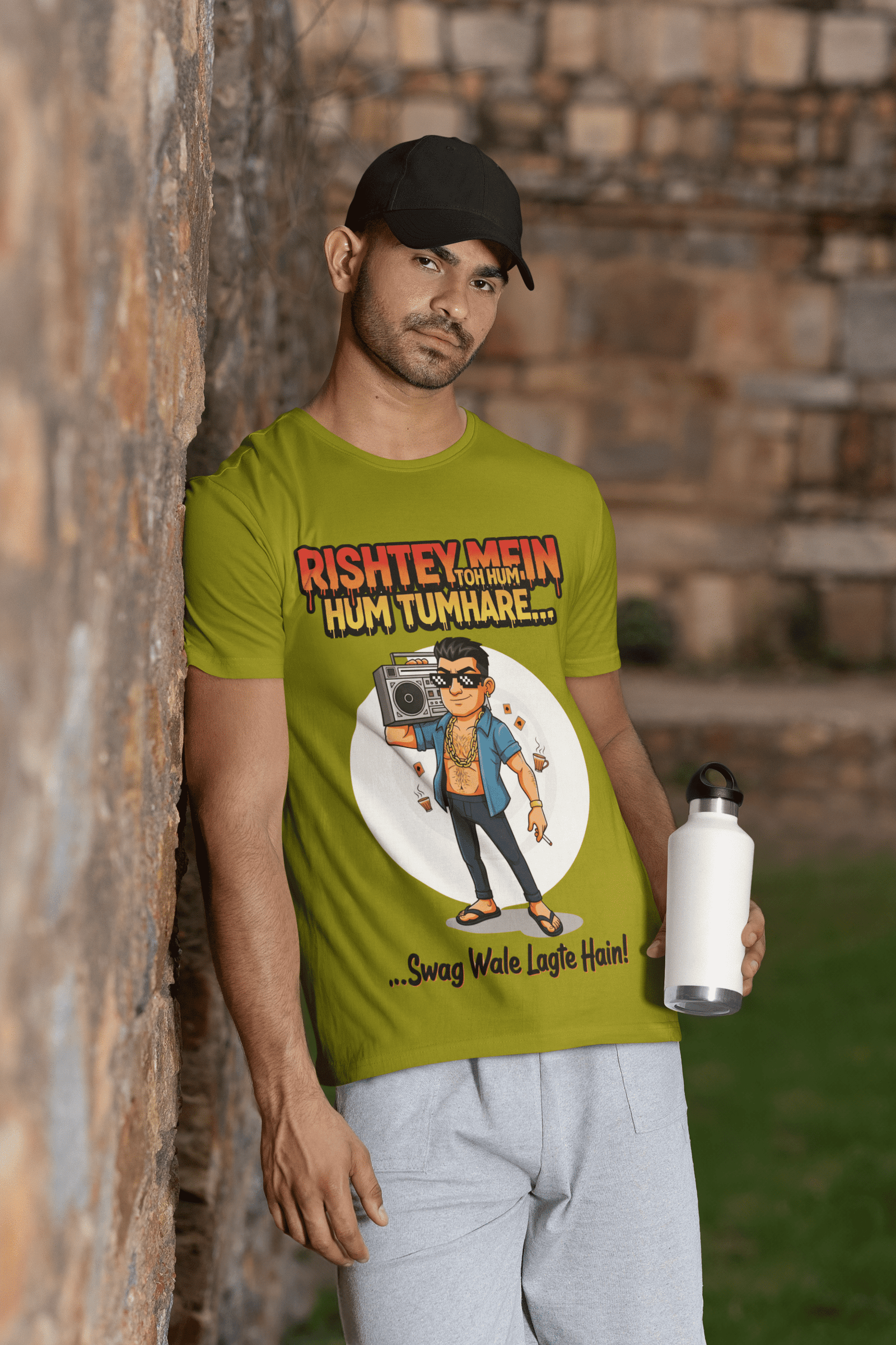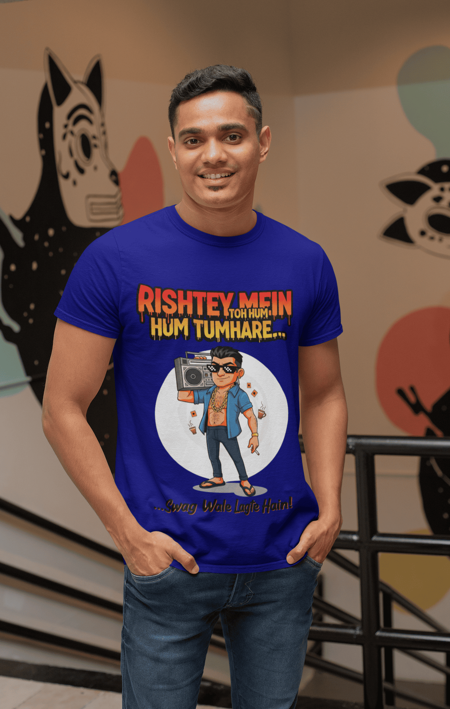 - Bold Typography: The iconic dialogue “RISHTEY MEIN TOH HUM… HUM TUMHARE…” is rendered in a dripping red-yellow gradient font, instantly recognizable. The punchline, “…Swag Wale Lagte Hain!”, appears in stylish orange gradient text, completing the hilarious parody.