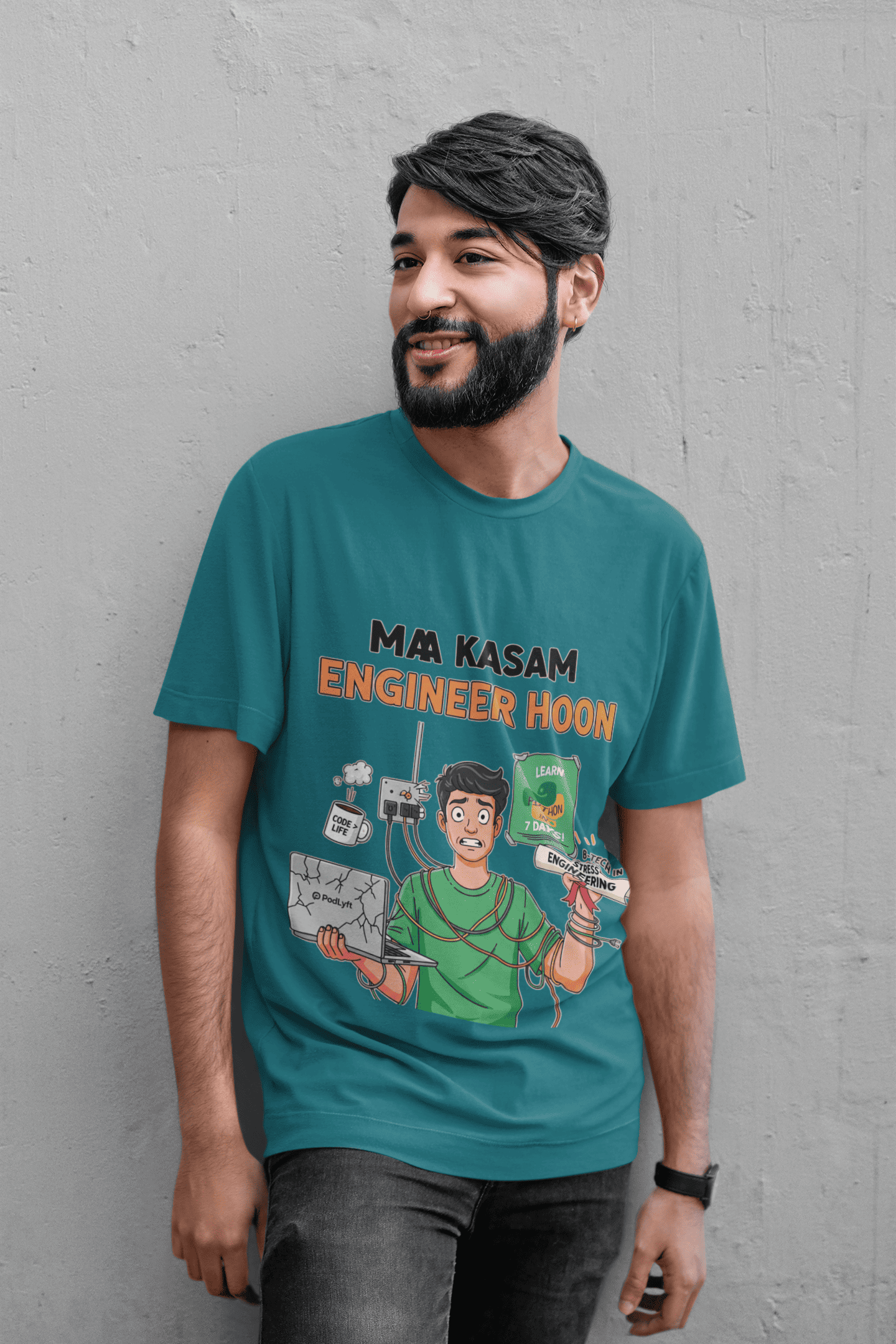 - Striking Typography: Above this scene, the phrase “MAA KASAM ENGINEER HOON” is displayed in bold, block letters, adding a dramatic and humorous declaration. The vibrant orange and black tones of the text stand out wonderfully against the muted greens of the background, giving the design a youthful and energetic feel.
