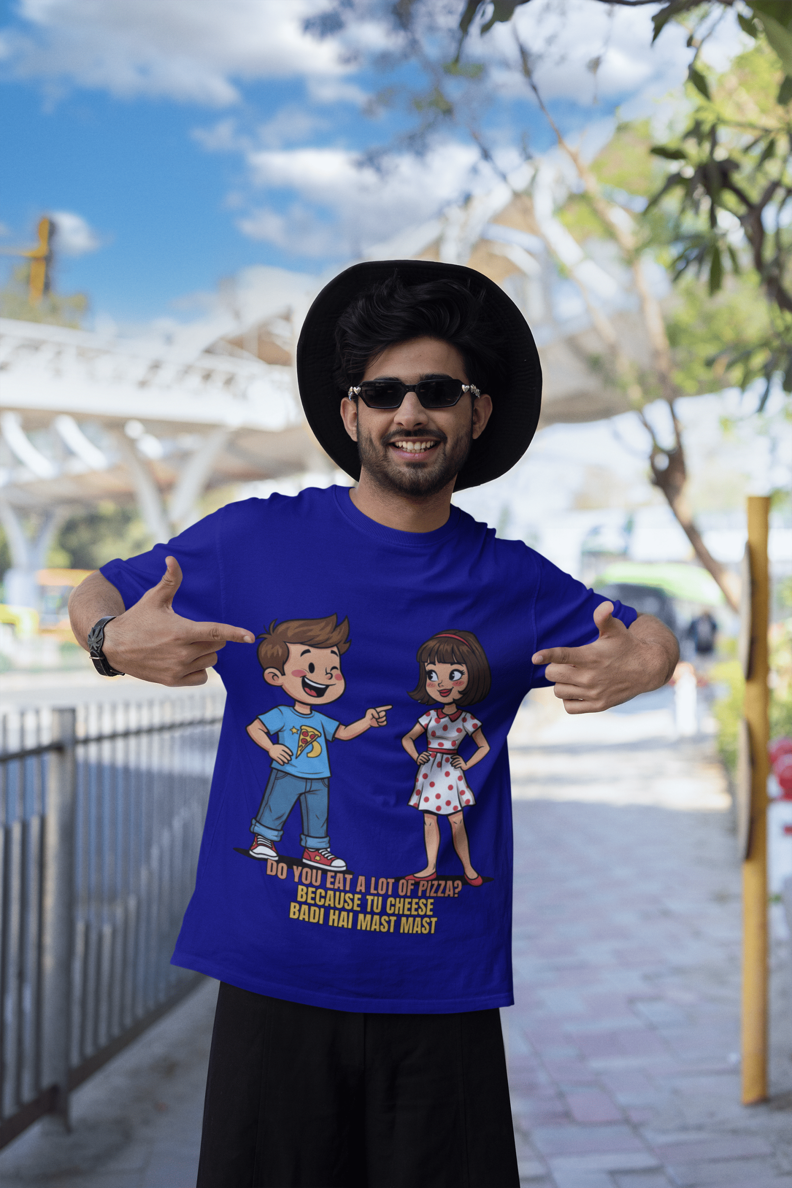 Men’s Cheesy Pickup Line T-shirt: Do You Eat a Lot of Pizza? Because Tu Cheese Badi Hai Mast Mast.