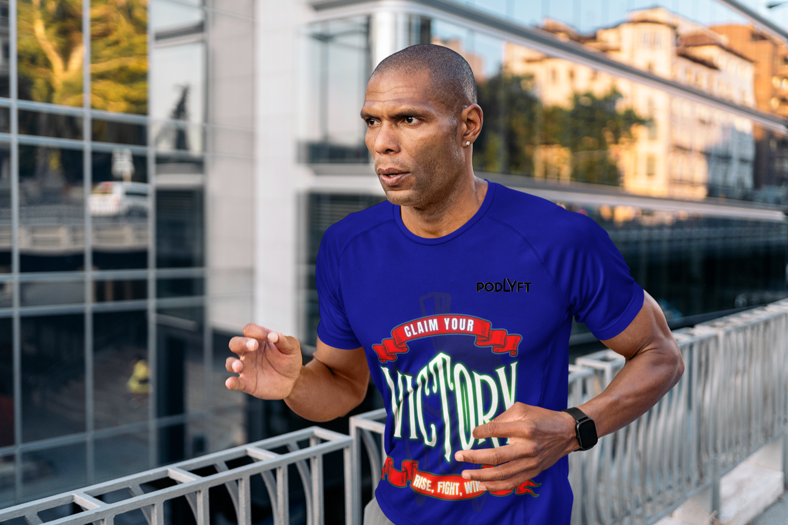 Claim Your Victory Tee - Rise, Fight, Win Design in blue color worn by a stylish individual strolling through a vibrant urban street, exuding motivation and resilience.
