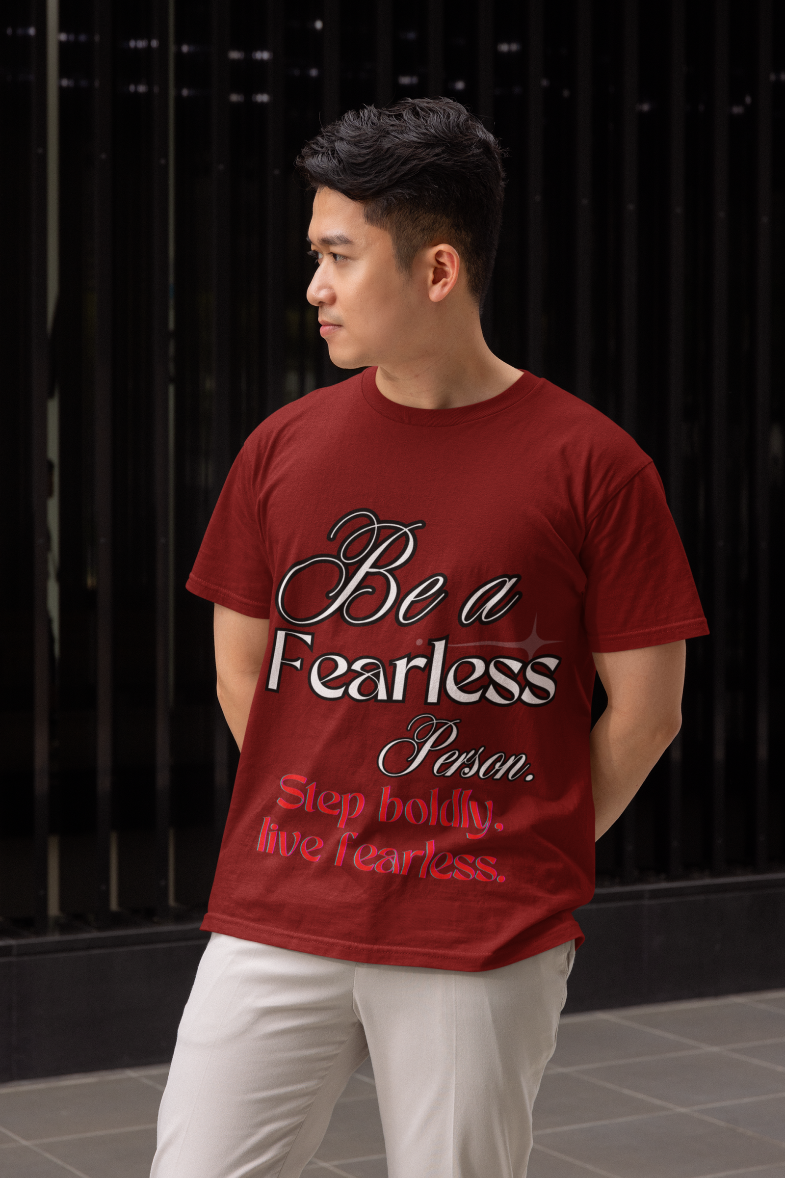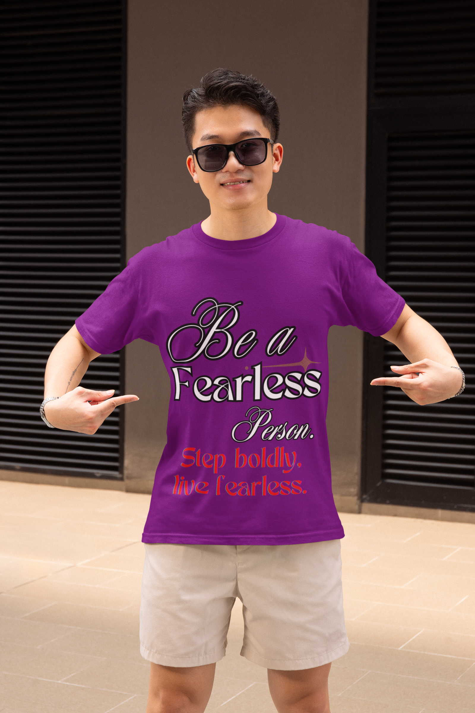 The message is thoughtfully divided into two parts. “Be a Fearless Person” serves as the primary directive, urging you to embody fearlessness in your identity. “Step boldly, live fearless” acts as the actionable follow-through, encouraging you to translate this mindset into your everyday actions and lifestyle. Together, these phrases create a harmonious blend of aspiration and instruction, making this confidence-boosting t-shirt a powerful tool for personal empowerment.