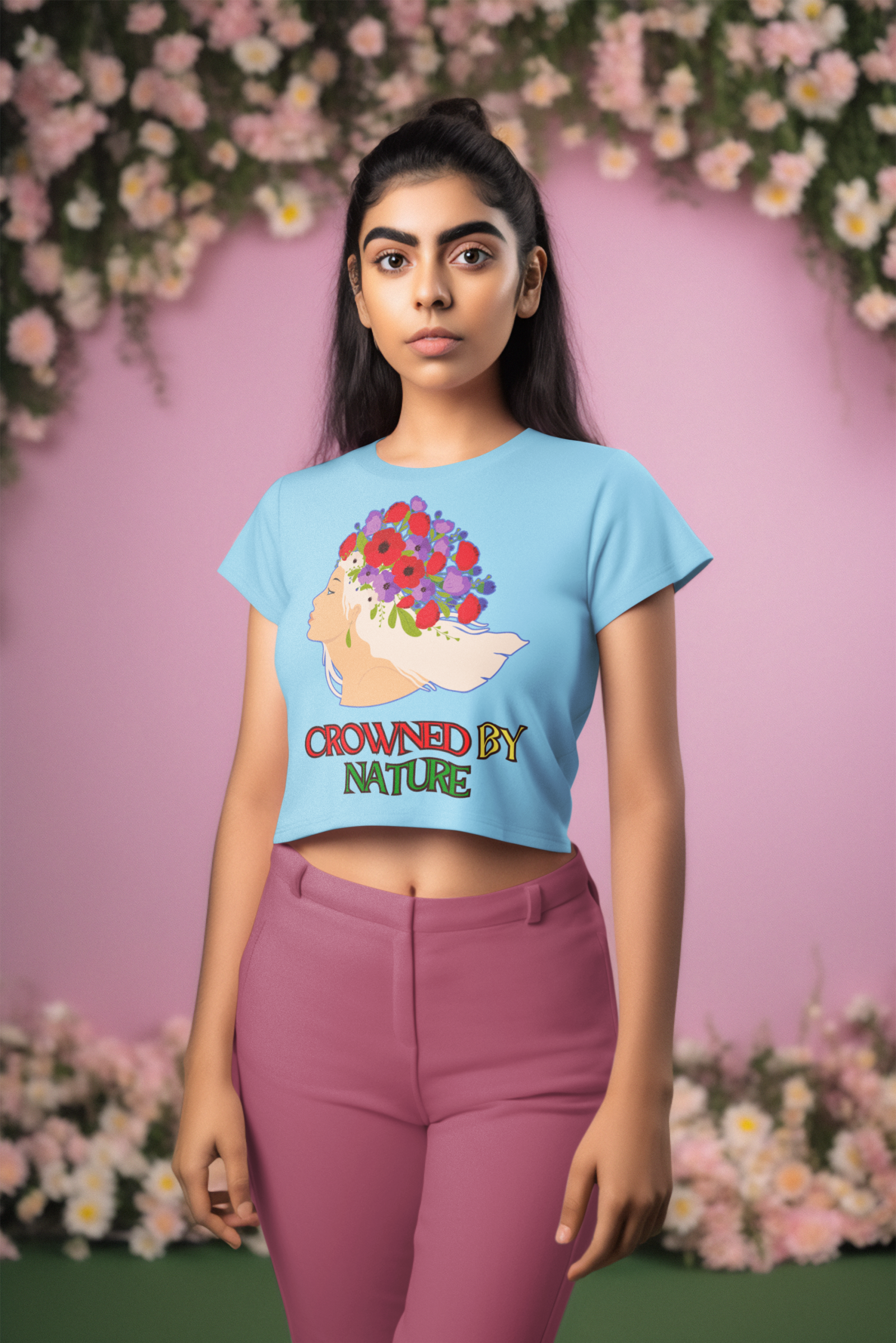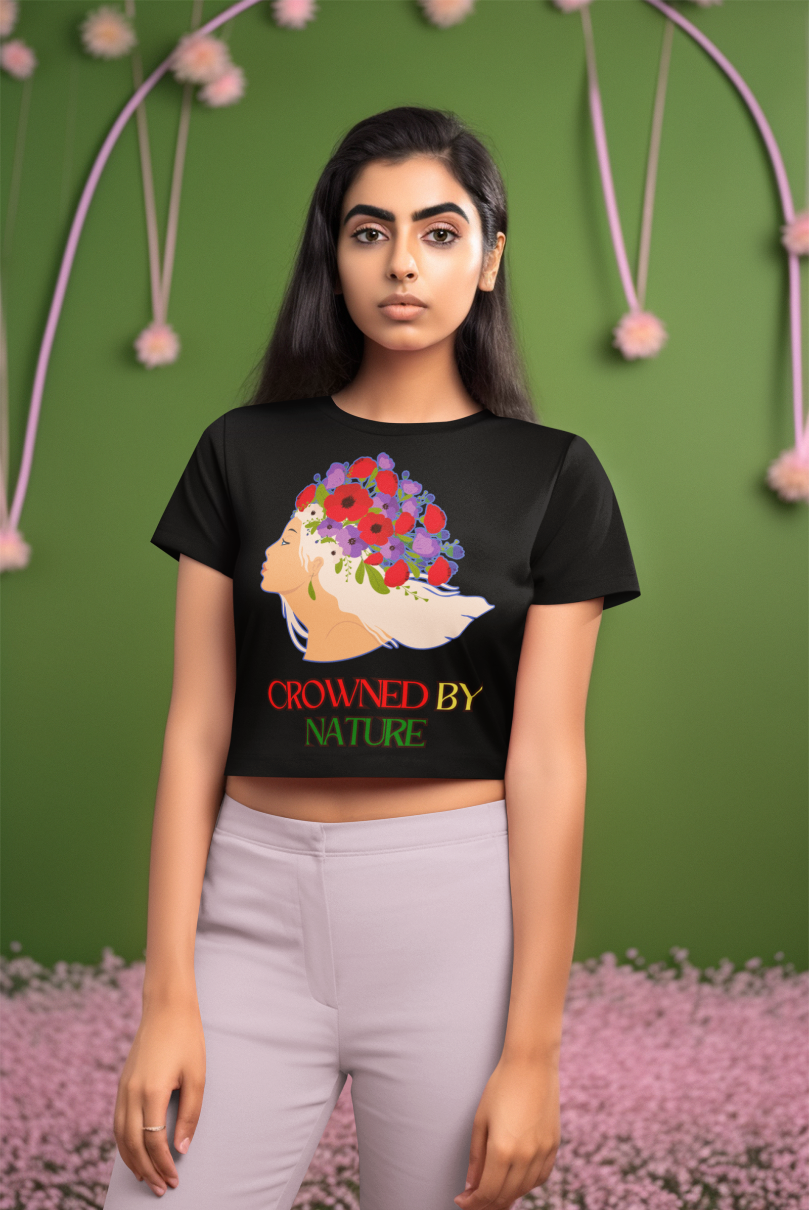 The floral arrangement gives a natural and bohemian feel, symbolizing a deep connection to nature. Below the illustration, the phrase “CROWNED BY NATURE” is displayed in bold, artistic typography, with the words “CROWNED” in red, “BY” in gold, and “NATURE” in green, enhancing the organic and regal theme of the design.