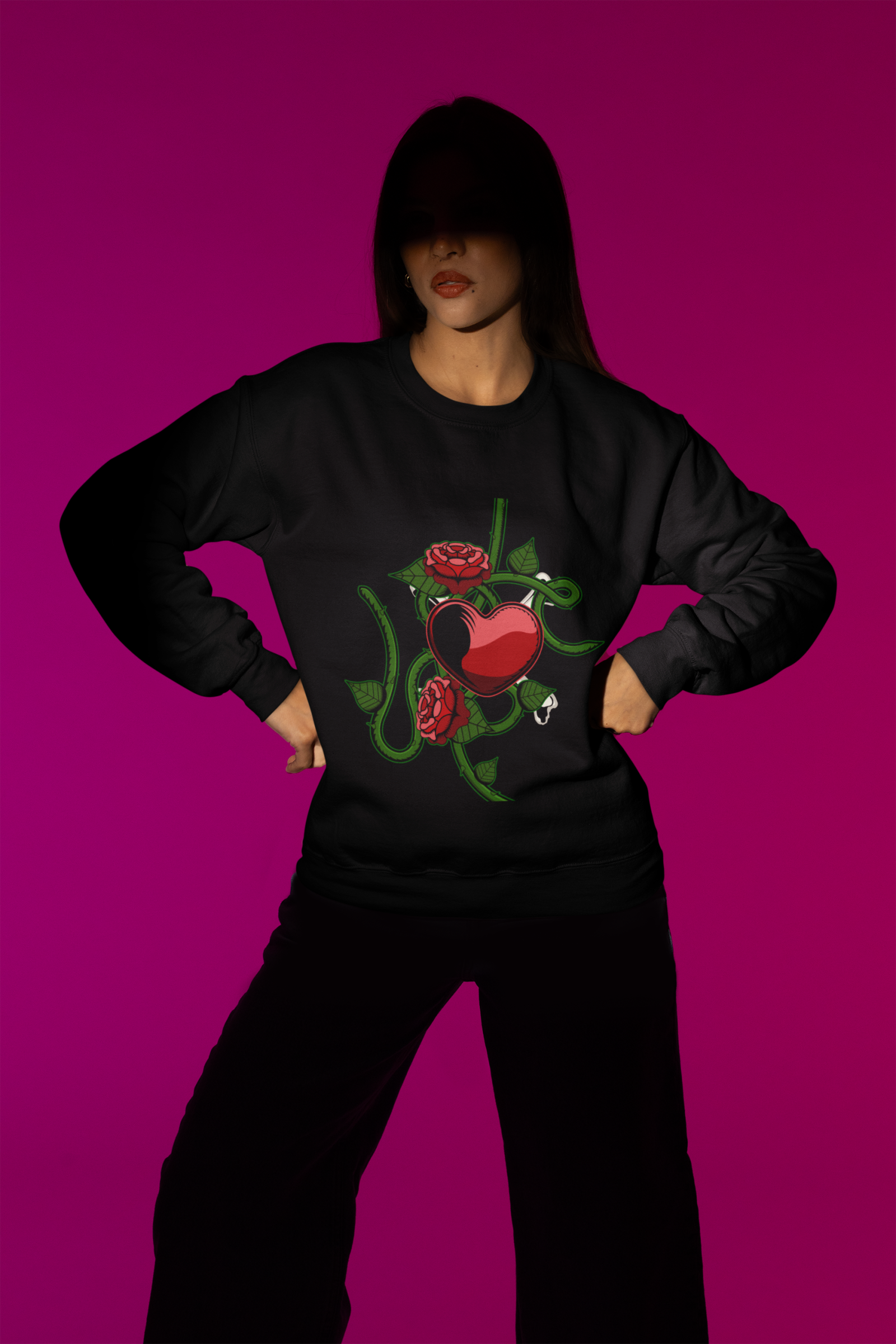 The captivating design of the Love Heart Sweatshirt is brought to life with superior colorfastness. This means that the vibrant red heart, thorny green vines, and red roses will retain their rich hues and visual appeal, even after repeated washing and wear. The colors are designed to resist fading, ensuring that your Trendy Sweatshirt for Women continues to make a bold statement with its striking design for years to come. This commitment to colorfastness ensures that the intricate details and emotional impact of the design remain vivid and impactful.