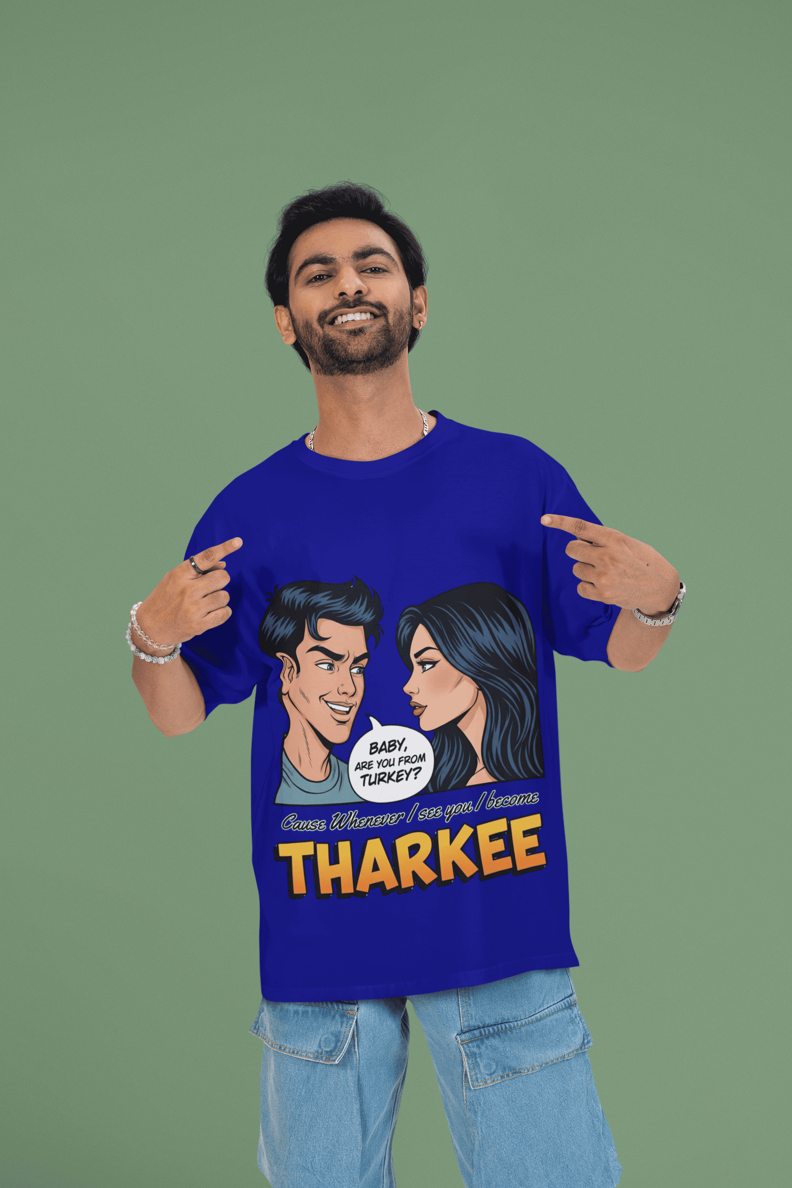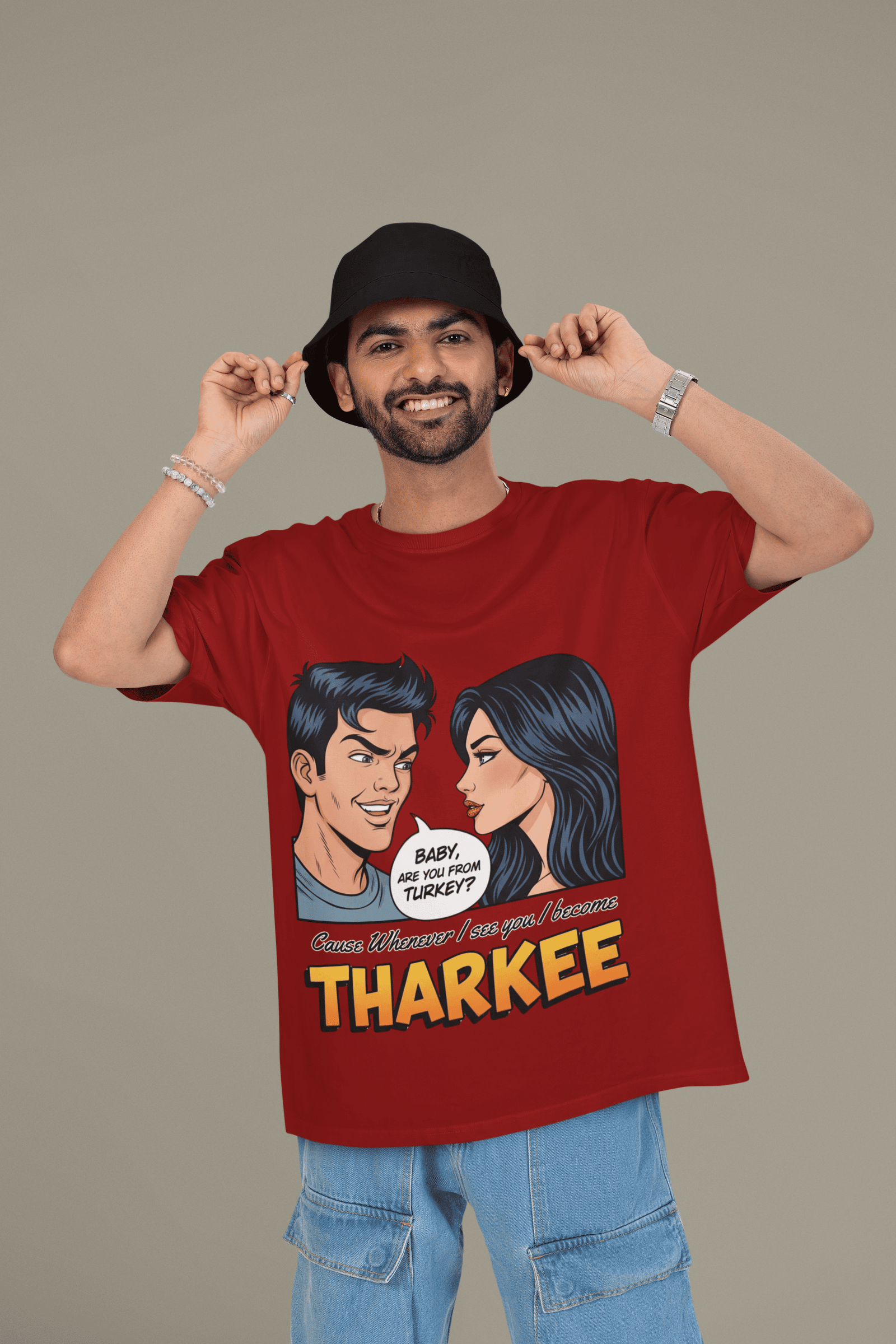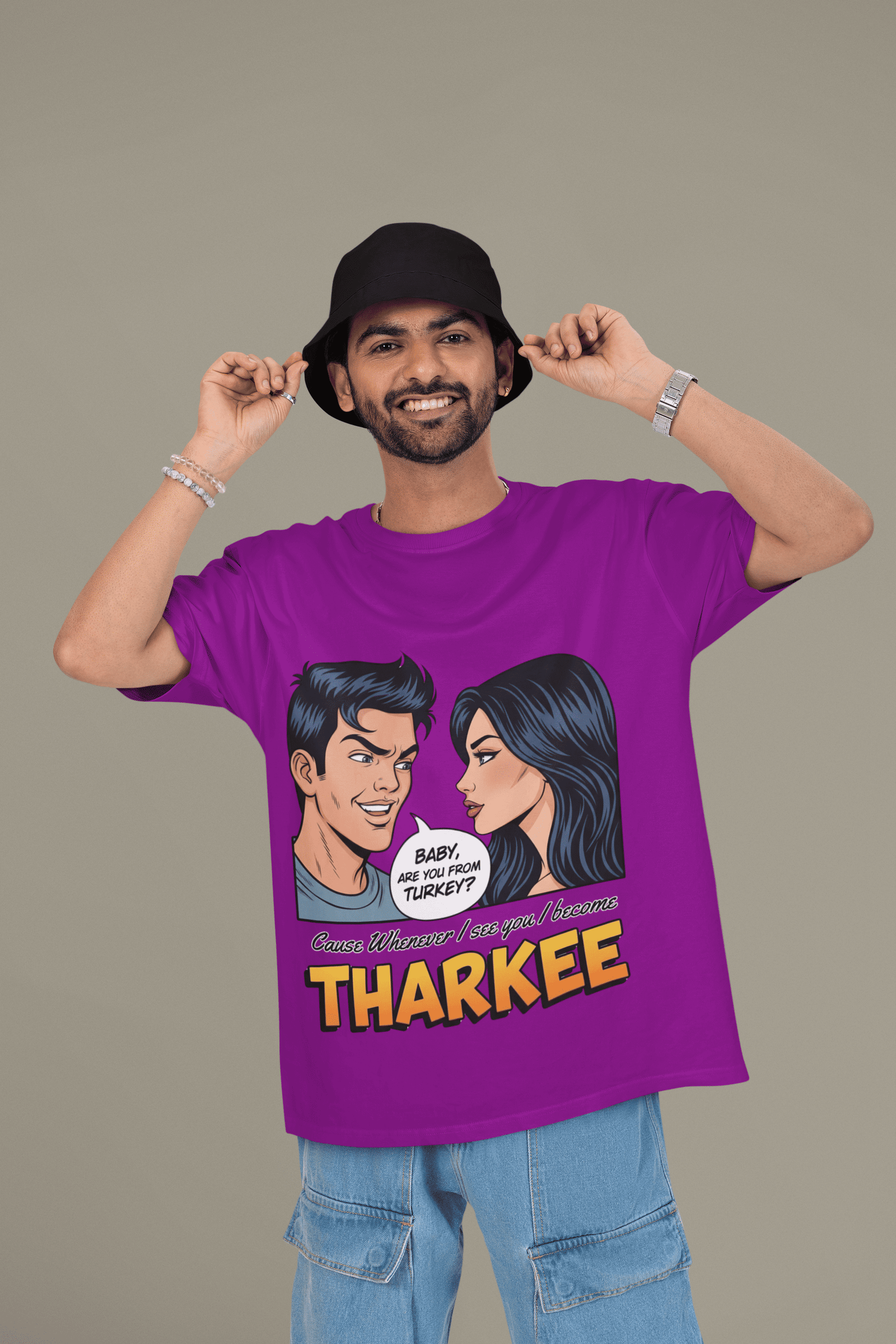Make a bold statement with our Men’s Tharkee T-Shirt featuring the hilarious desi pickup line: “BABY ARE YOU FROM TURKEY? Cause Whenever I see You, I Become THARKEE.” This funny oversized tee is perfect for guys who love turning heads, sparking laughs, and owning their humor in style.