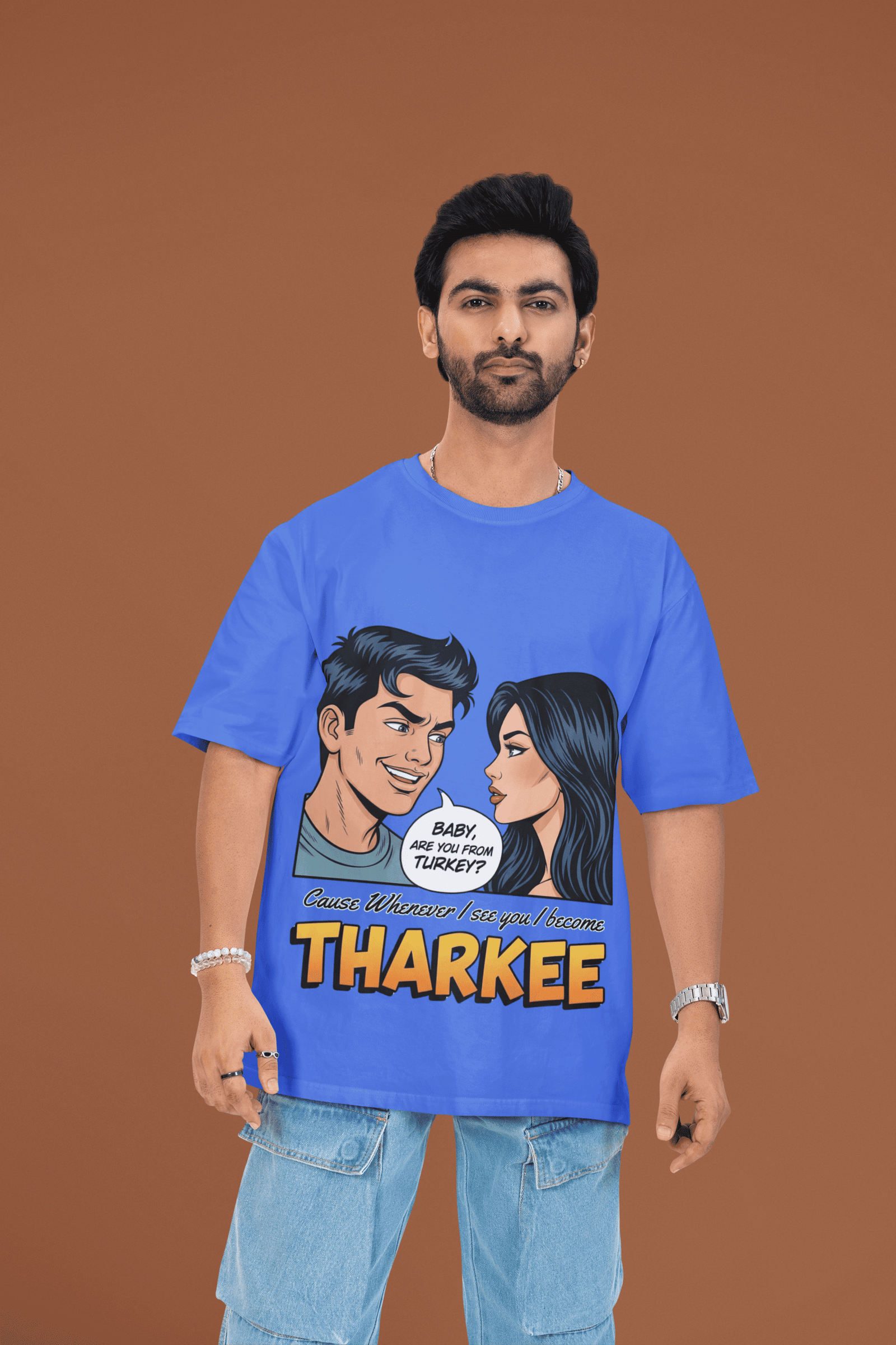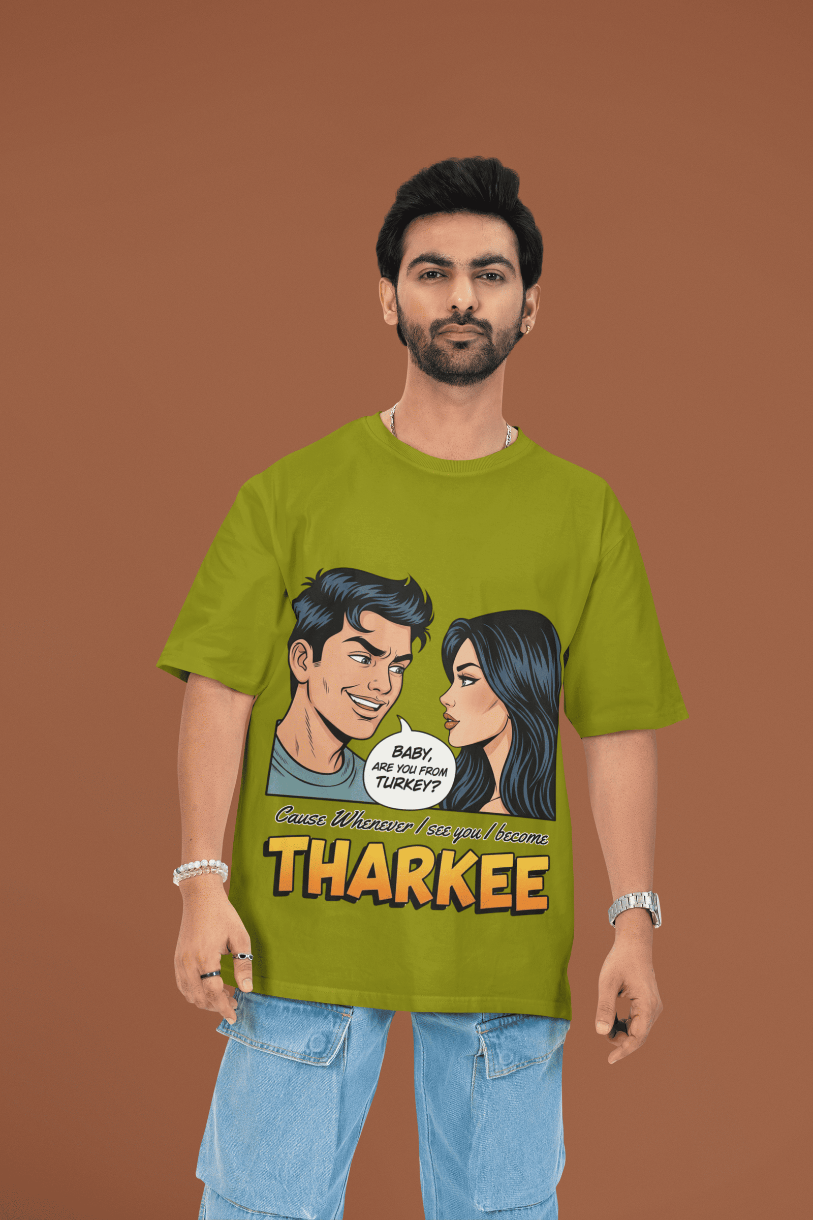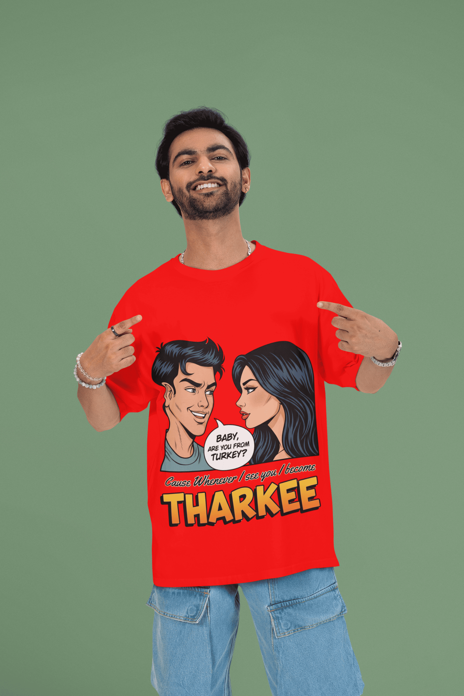 Make a bold statement with our Men’s Tharkee T-Shirt featuring the hilarious desi pickup line: “BABY ARE YOU FROM TURKEY? Cause Whenever I see You, I Become THARKEE.” This funny oversized tee is perfect for guys who love turning heads, sparking laughs, and owning their humor in style.