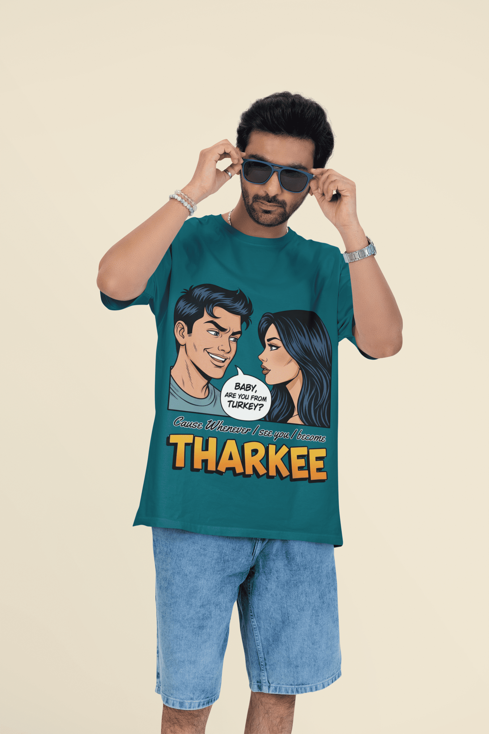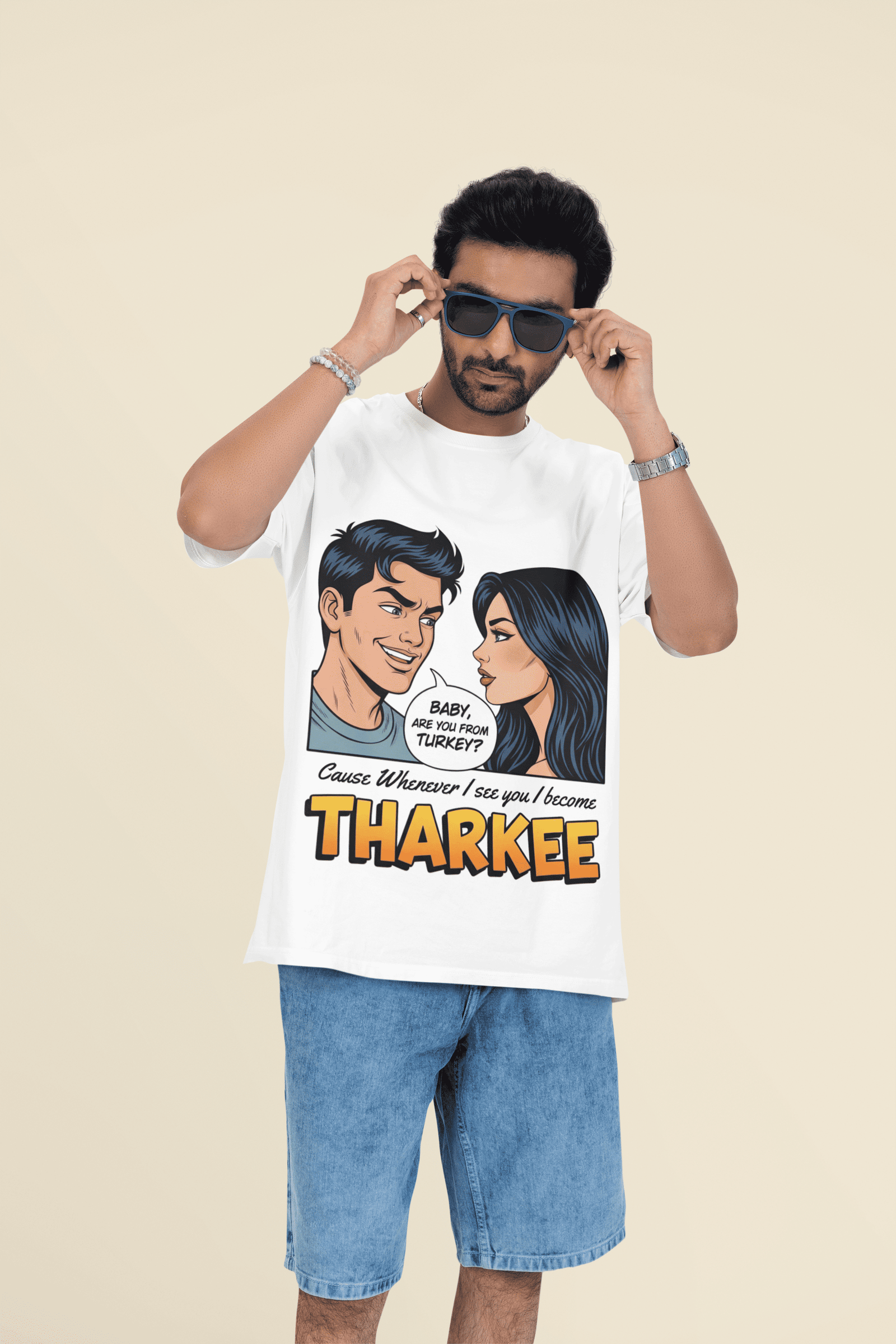Man wearing a PodLyft's Tharkee T-shirt with a comic-style design and the text “Baby, are you from Turkey? Cause whenever I see you I become Tharkee,” paired with blue denim shorts.